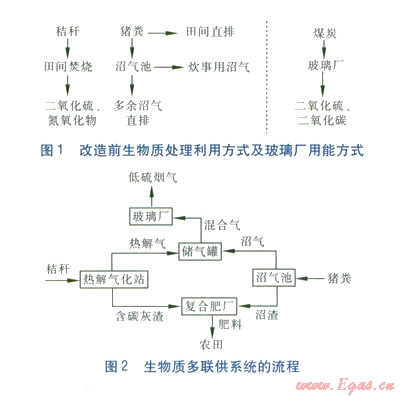 湘潭縣某玻璃廠生產(chǎn)能耗巨大,燃煤成本占年運(yùn)營(yíng)成本的25%,生產(chǎn)過(guò)程中排放大量S02、C02。經(jīng)調(diào)研發(fā)現(xiàn),湘潭縣被譽(yù)為“全國(guó)養(yǎng)豬第一縣”,該玻璃廠所在村莊建有130多口沼氣池,主要以當(dāng)?shù)氐呢i糞為原料,產(chǎn)生的沼氣除部分用于炊事外,其他均排至大氣。另外,由于豬糞產(chǎn)量巨大,在滿足沼氣池使用之外仍有過(guò)剩豬糞直排田間,在開(kāi)放環(huán)境下產(chǎn)生甲烷、二氧化碳等。據(jù)初步估算,外排沼氣和過(guò)剩豬糞每年向環(huán)境排放的溫室氣體折合成二氧化碳約2 800 t/a。當(dāng)?shù)赜袊?guó)家級(jí)超級(jí)水稻大規(guī)模推廣基地,目前村民大多采用田間焚燒的方法處理秸稈,大量生物質(zhì)能被浪費(fèi),排放大量二氧化硫及氮氧化物。