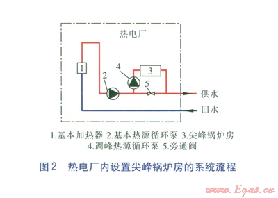 熱電廠內(nèi)設(shè)置尖峰鍋爐房(系統(tǒng)流程見圖2)。由圖2可知,熱水經(jīng)過基本加熱器加熱后進(jìn)入熱網(wǎng)熱負(fù)荷主干線。當(dāng)供暖期處于初末寒期時(shí),旁通閥開啟,尖峰鍋爐房不投入運(yùn)行。當(dāng)進(jìn)入嚴(yán)寒期時(shí),旁通閥關(guān)閉,尖峰鍋爐房投入運(yùn)行,基本加熱器出水經(jīng)尖峰鍋爐房加熱至設(shè)計(jì)溫度,進(jìn)入熱網(wǎng)主干線。對(duì)于這種設(shè)置方式,峰荷熱源的投資、運(yùn)營方均為熱電廠。