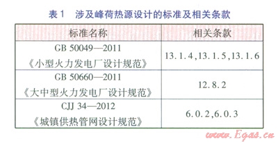 目前,涉及峰荷熱源設(shè)計(jì)的標(biāo)準(zhǔn)及相關(guān)條款見表1。針對(duì)小型火力發(fā)電廠,GB 50049-2011第