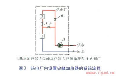 熱電廠內(nèi)設(shè)置尖峰加熱器(系統(tǒng)流程見圖3)。由圖3可知,當(dāng)供暖期處于初末寒期時(shí),閥門4開啟,閥門5、6關(guān)閉,尖峰加熱器不投入運(yùn)行。當(dāng)進(jìn)入嚴(yán)寒期時(shí),閥門4關(guān)閉,閥門5、6開啟,尖峰加熱器投入運(yùn)行。雖然采用尖峰加熱器作為峰荷熱源的造價(jià)較低且易于實(shí)現(xiàn),但尖峰加熱器需較高參數(shù)的蒸汽,對(duì)發(fā)電量有一定影響。對(duì)于這種設(shè)置方式,峰荷熱源的投資、運(yùn)營方均為熱電廠。