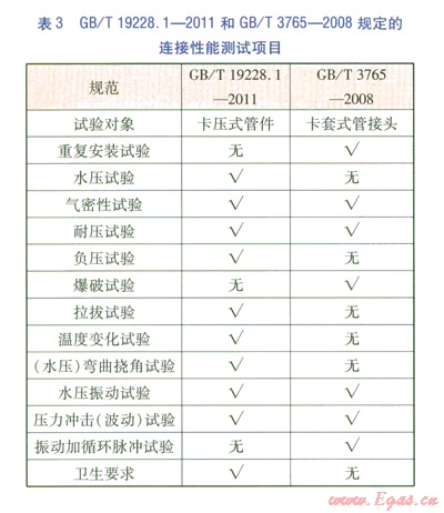 在表3所示的測(cè)試項(xiàng)目中,溫度變化試驗(yàn)及衛(wèi)生要求是針對(duì)自來(lái)水應(yīng)用的。振動(dòng)加循環(huán)脈沖試驗(yàn)是水壓振動(dòng)試驗(yàn)和壓力沖擊(波動(dòng))試驗(yàn)的組合??紤]到全圓弧螺紋連接的薄壁不銹鋼管在水和天然氣兩種場(chǎng)合應(yīng)用,全圓弧螺紋接口連接性能測(cè)試項(xiàng)目應(yīng)涵蓋表3中卡壓式管件的所有測(cè)試試驗(yàn),性能要求也可與卡壓式管件看齊。同時(shí)與卡壓式管件不同,全圓弧螺紋接口連接是螺紋連接,因此應(yīng)該再選取表3中卡套式管接頭的重復(fù)安裝試驗(yàn)和爆破試驗(yàn),性能要求應(yīng)與卡套式管接頭相同。GB/T3765-2008規(guī)定振動(dòng)加循環(huán)脈沖試驗(yàn)可以替代單獨(dú)的水壓振動(dòng)試驗(yàn)和壓力沖擊(波動(dòng))試驗(yàn),全圓弧螺紋接口性能測(cè)試也可作此要求。全圓弧螺紋接口管件如果能夠達(dá)到上述的連接性能要求,則可保證在自來(lái)水和燃?xì)庑袠I(yè)應(yīng)用中的安全性。