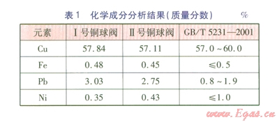 分別對Ⅰ號、Ⅱ號銅球閥閥體的化學(xué)成分進行檢測分析,分析結(jié)果見表1。