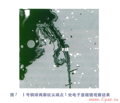 對Ⅱ號銅球閥裂口尖端處的灰色物質(zhì)試樣進行掃描電子顯微鏡觀察,結(jié)果表明:裂紋表面可見明顯灰色覆蓋物。能譜分析結(jié)果表明主要成分為Cu、Zn、S、O和少量Cr、Mn等,Ⅱ號銅球閥裂紋尖端點l處的電子顯微鏡觀察結(jié)果和表面能譜分析結(jié)果見圖9、10。