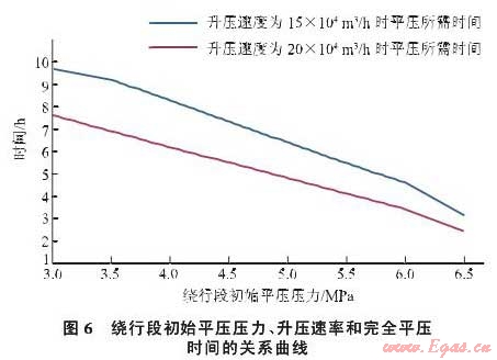 按照15萬m3/h和20萬m3/h的升壓速率,從繞行段整體升壓至3MPa開始,計算完全平壓所需要的時間,得出繞行段初始壓力、升壓速率和時間之間的關系曲線(圖6)。繞行段升壓至4.5MPa后,按照20萬m3/h的升壓速率,完全平壓需要5.5h;在繞行段升壓至5.2MPa后,按照15萬m3/h的升壓速率,完全平壓需要6h。為確保升壓盡快完成,同時考慮安全因素和計算誤差,選擇在繞行段升壓至4.5MPa作為進氣平壓點。
