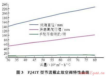 No.6閥室的旁通和放空截止閥均采用FJ41Y-600節(jié)流截止放空閥,根據廠家提供的該閥滿足流量、壓差的開度范圍,模擬壓差為8~0.2MPa的節(jié)流特性曲線(圖3)。在(30~80)萬m3/h的流量條件下,FJ41Y型節(jié)流截止閥的流道直徑、開啟高度行程、手輪開啟的轉數與通過流量呈線性關系。當手輪開啟5.8轉時,通過流量將達到30萬m3/h,遠遠超出置換投產期間的控制流量;當手輪每開啟0.5轉時,通過流量將增加5萬m3/h。