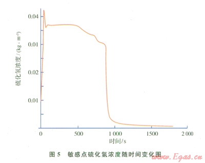 對于含硫天然氣擴(kuò)散引起的風(fēng)險(xiǎn),需要計(jì)算特定位置硫化氫含量的變化情況,即各網(wǎng)格點(diǎn)或敏感目標(biāo)處硫化氫含量隨時(shí)間變化情況。分別以某井場井噴和某天然氣凈化裝置事故為例,得到事故發(fā)生時(shí)硫化氫的時(shí)空分布情況(圖2~5)。