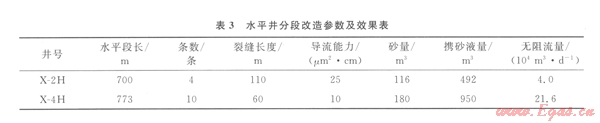 依據(jù)上述研究論證結(jié)果,確定了合理的壓裂水平井參數(shù),以保證投資最少、開(kāi)發(fā)效果最優(yōu)為目的。使用優(yōu)化的壓裂水平井裂縫參數(shù)在該區(qū)塊應(yīng)用了8口井,單井無(wú)阻流量7.2×104~27.6×104 m3/d.平均無(wú)阻流量為16.3×104 m3/d,與參數(shù)優(yōu)化前的無(wú)阻流量9.8×104 m3/d相比,增產(chǎn)效果顯著。