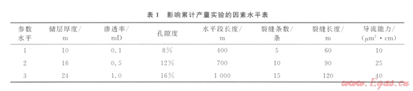 將儲(chǔ)層厚度、滲透率、孔隙度、水平段長(zhǎng)度、裂縫條數(shù)、裂縫長(zhǎng)度、裂縫導(dǎo)流能力作為影響累計(jì)產(chǎn)量的7個(gè)因素,再根據(jù)各因素選取了3個(gè)水平(表1)。