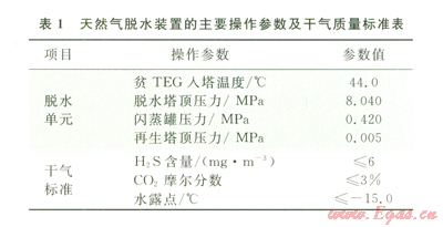 目前,國(guó)內(nèi)天然氣脫水主要采用三甘醇(TEG)脫水法,川渝地區(qū)某天然氣凈化廠600×104 m3/d天然氣脫水裝置也采用典型的TEG脫水法脫除來(lái)自脫硫單元凈化濕氣中的水分,以降低天然氣的露點(diǎn)。表l為該天然氣脫水裝置的主要操作參數(shù)及干氣標(biāo)準(zhǔn)。圖2為該天然氣脫水裝置的工藝流程圖。