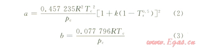 式中p為體系壓力,Pa;V為摩爾體積, m3;T為絕對(duì)溫度,K;R為氣體常數(shù),無(wú)量綱;a、b可表示為: