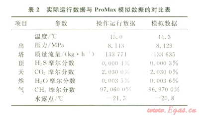 依據(jù)該天然氣脫水裝置的運(yùn)行數(shù)據(jù),將各原料氣及TEG的參數(shù)輸入脫水裝置工藝模型,調(diào)整模型各 個(gè)參數(shù),使模擬數(shù)據(jù)與實(shí)際運(yùn)行數(shù)據(jù)達(dá)到基本吻合,使輸出的凈化產(chǎn)品氣到達(dá)凈化干氣的氣質(zhì)標(biāo)準(zhǔn)。表2為實(shí)際運(yùn)行數(shù)據(jù)與ProMax模擬數(shù)據(jù)對(duì)比衷,據(jù)此來(lái)驗(yàn)證所建立ProMax模型的準(zhǔn)確性。
