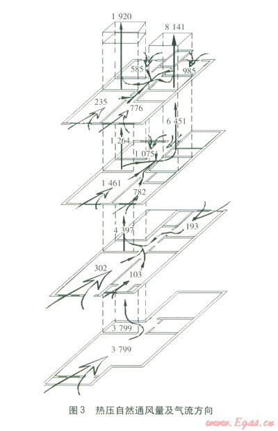 最終得到各支路的熱壓自然通風(fēng)量、氣流方向(見圖3),圖3中各數(shù)值的單位為m3/h。