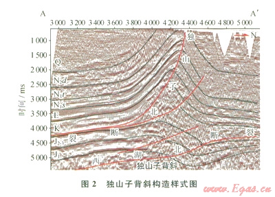 圖2顯示了獨(dú)山子北斷裂沿白堊系吐谷魯群泥巖層滑脫,向上突破進(jìn)入古近系地層,控制了獨(dú)山子背斜斷層傳播褶皺的發(fā)育。獨(dú)山子背斜中淺層為典型的斷層傳播褶皺。其特點(diǎn)為:①背斜后翼模擬下盤斷坡產(chǎn)狀;②形成向斷層運(yùn)動(dòng)方向傾倒的不對(duì)稱背斜;③常有突破斷層發(fā)育;④突破斷層位移量很小[4]。