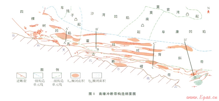 1)南緣沖斷帶3套構(gòu)造滑脫層控制了南緣逆沖推覆斷裂的發(fā)育特征,逆沖推覆斷裂發(fā)育的層位及特征對(duì)南緣區(qū)域構(gòu)造展布特征及局部構(gòu)造樣式起到了明顯的控制作用。