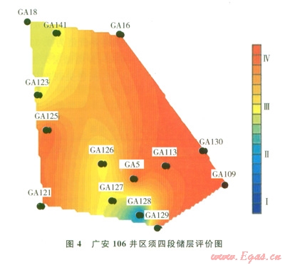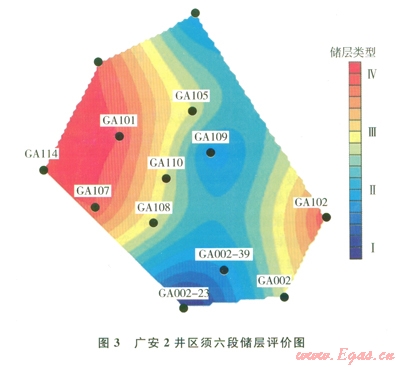 應(yīng)用儲層評價方法對廣安2井區(qū)須六段儲層和廣安106井區(qū)須四段儲層進行了分類評價(圖3、4)。從圖中可以看出,廣安2井區(qū)須六段儲層中部南北向儲層為Ⅰ、Ⅱ類儲層;向東、西兩翼發(fā)展儲層逐漸變差,為Ⅲ、Ⅳ類儲層。因而,中部南北向為氣藏富集區(qū),是氣藏開發(fā)的重點區(qū)域。廣安106井區(qū)須四段儲層整體為Ⅲ、Ⅳ類儲層,西北翼和南部儲層相對較好。