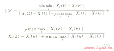 為所有比較序列各個指標(biāo)絕對差的最大值;| X0 (k)- Xi(k)|為第i個序列第k個指標(biāo)與參考序列絕對差值。