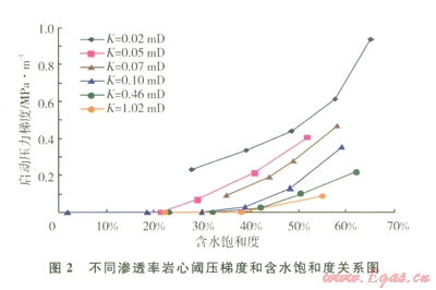 低滲透砂巖含水氣藏巖樣滲流實驗表明,當(dāng)含水飽和度較高時,氣體滲流出現(xiàn)非達西流現(xiàn)象,存在閾壓梯度[8]。閾壓梯度與巖心滲透率及含水飽和度相關(guān)(圖2),巖心滲透率越低,含水飽和度越高,閾壓梯度越大。閾壓梯度可作為衡量儲層流動性強弱的指標(biāo),也是影響儲量動用程度的重要參數(shù),因此,將閾壓梯度作為低滲含水儲層評價參數(shù)是必要的。
