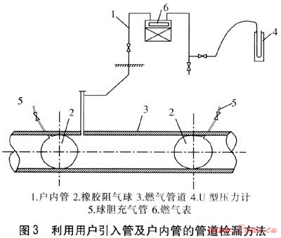 依照圖2的原理,筆者還研究出另外一種方法。具體做法是:先在有泄漏疑點的管段上鉆3個絲孔(兩側(cè)為裝球孔,中間是測壓孔,懷疑的泄漏點在兩個裝球孔之間),再將測壓膠管一端從測壓孔伸進(jìn)兩球間的測漏管段中,然后再分別從兩個裝球孔各送入一個球,各自充氣封堵后使待測管段形成密閉空間。通過測壓膠管及U型壓力計可以知道被測管段壓力變化。如泄壓,還可以通過測壓膠管向密閉管段內(nèi)充氣(以氮氣等惰性氣體為宜)升壓,并觀察壓力變化。如此可進(jìn)行反復(fù)試驗,直到確定泄漏點為止。如果測試中穩(wěn)壓較好,則可確認(rèn)漏氣點不在兩球之間的管段,應(yīng)繼續(xù)如法鉆孔堵球查找。