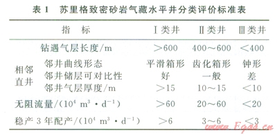 對于大面積分布的強(qiáng)非均質(zhì)性致密氣田,要實現(xiàn)對儲量的規(guī)模動用,所需鉆井?dāng)?shù)量多,而且與常規(guī)的整裝氣田不同,不但區(qū)塊間產(chǎn)能差異較大,而且相同區(qū)塊內(nèi)由于儲層的強(qiáng)非均質(zhì)性相鄰的井間產(chǎn)能差異也較大。在開發(fā)早期由于井?dāng)?shù)較少難以確定準(zhǔn)確的平均單井產(chǎn)能,而且單井平均產(chǎn)能也不能反映區(qū)塊內(nèi)相互之間的差異性。宜采用氣井分類評價的思路,建立不同類型氣井地質(zhì)模型與動態(tài)特征的相關(guān)關(guān)系,一方面可以通過地質(zhì)目標(biāo)的評價進(jìn)行產(chǎn)能的初步判斷和氣井分類配產(chǎn),另一方面可根據(jù)不同類型井的鉆遇比例來評價區(qū)塊的開發(fā)效果,以使評價方法更具靈活性。一般可分為3類井,好井經(jīng)濟(jì)效益明顯,中等井為邊際效益,差井經(jīng)濟(jì)效益差、需要好井來彌補(bǔ)。