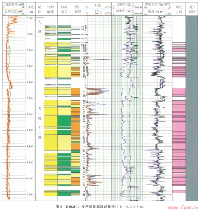 結(jié)合單井井身結(jié)構(gòu)、同井質(zhì)量等因素,具體優(yōu)化氣井投產(chǎn)層段。如D402H井鉆遇氣層750m,含氣井段跨度l055.3m,固井質(zhì)量?jī)?yōu)秀??紤]該井井段跨度大,飛三段氣層有鄰井控制,為降低投產(chǎn)作業(yè)難度和節(jié)約投資,對(duì)于氣層相對(duì)分散的飛三段氣層(厚度33m,跨度ll0m)不射孔(圖3)。通過(guò)投產(chǎn)層段優(yōu)化,在不影響單井產(chǎn)能等開發(fā)指標(biāo)的前提下,合理避射氣層,降低了投產(chǎn)作業(yè)費(fèi)用。
