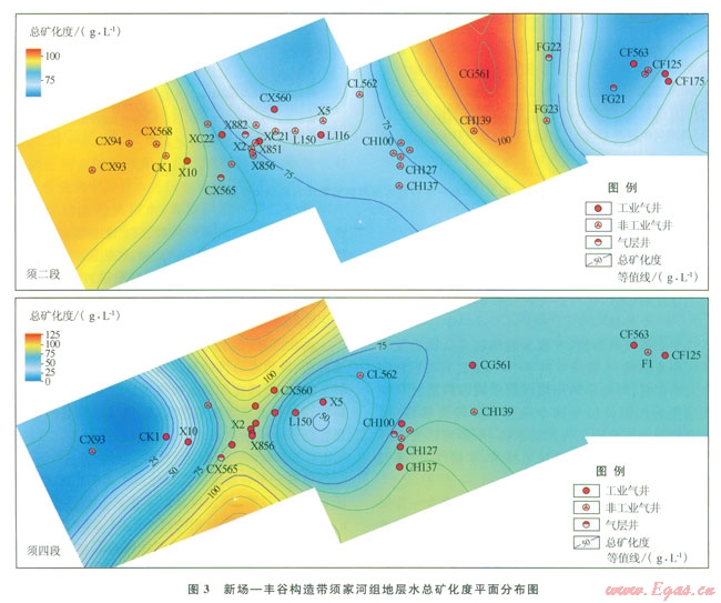 從平面上看,須二段現(xiàn)今氣藏氣井多位于地層水總礦化度大于75g/L的高礦化度區(qū)域,更有利于水溶脫氣;須四段現(xiàn)今氣藏則正好相反,氣井多位于地層水總礦化度小于75g/L的地區(qū),才會出現(xiàn)多數(shù)鉆井產(chǎn)水或氣水同產(chǎn)的局面。
