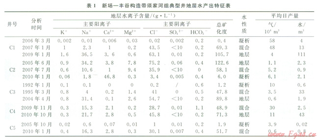 選取該區(qū)須家河組氣藏典型井進行生產(chǎn)動態(tài)與地層水產(chǎn)出特征綜合分析(表1)。須二段氣藏Cl井生產(chǎn)初期氣產(chǎn)量大于50×104m3/d、水產(chǎn)量小于5m3/d;C3井生產(chǎn)初期氣產(chǎn)量大于l0×104m3/d、水產(chǎn)量小于1m3/d,此時水分析總礦化度極低,分布在0.094~2.694g/L,產(chǎn)出水為氣藏凝析水;之后氣產(chǎn)量降低,水產(chǎn)量增加,產(chǎn)出水從混合水變?yōu)榈貙铀?span lang="EN-US">C2井情況相反,2007年氣藏未打開之前,氣、水產(chǎn)量均不高,產(chǎn)出水礦化度較高,2007年之后儲層改造獲得成功,獲5×104~6×104m3/d的天然氣產(chǎn)能,產(chǎn)出水總礦化度隨著時間的推移不斷降低,可見地層水中凝析水的混合逐漸增多。