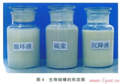 生物硫磺的生成機理和化學(xué)硫磺的生成機理不同[23],微生物通過自身特殊代謝過程,將生成的硫磺排出體外,同時又和微生物包裹在一起,因而硫磺在溶液中以乳濁液的形式存在,具有親水性(圖4)。通過實驗測定了生物硫磺的密度、黏度和粒徑等物化指標(biāo),為生物硫磺后期處理方法的選擇提供了重要參考依據(jù)。