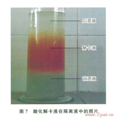 隔離液的作用是將解卡液和鉆井液隔開(kāi),防止竄漿,避免引起鉆井液性能變化太大,確保解卡液的酸化效果,通常使用增黏劑來(lái)配置,做了隔離液與酸化解卡液配伍性實(shí)驗(yàn),放置時(shí)間為24h[11](圖7),可以看出酸化解卡液與隔離液配伍性較好。