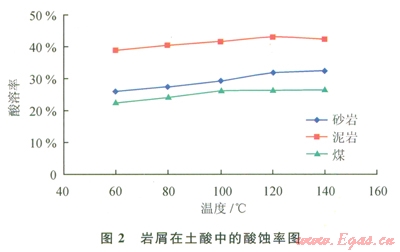 酸液對(duì)白云巖、石灰?guī)r的酸化效果最好,酸蝕率超過(guò)50%,其次是泥巖;酸液對(duì)鉆井液泥餅同樣具有一定的酸溶率,在20%~40%之間。土酸整體的酸化效果優(yōu)于鹽酸,但差距較小。溫度越高,酸化效果越好。因此,在鉆遇易酸化地層時(shí)出現(xiàn)卡鉆事故時(shí)[2],理論上采用浸泡酸化解卡液的辦法是可行的[3]。