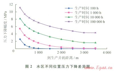 通過理論計(jì)算能了解水區(qū)不同位置壓力下降幅度的差異。圖2展示的是一個(gè)理論計(jì)算結(jié)果,儲層滲透率為10mD,裂縫發(fā)育帶水侵通道寬度為1000 m,水侵速度為l000m3/a。從圖2可看出,只要觀察井離生產(chǎn)井足夠遠(yuǎn),其井底靜壓力基本能代表水區(qū)平均地層壓力。否則,需要根據(jù)類似于式(5)的計(jì)算模型推算離生產(chǎn)井更遠(yuǎn)處的靜壓力。由于滲透性較好的氣藏開發(fā)井距通常都大于lkm,圖2顯示在這種條件下壓差與觀測點(diǎn)到生產(chǎn)井的距離大體呈線性關(guān)系,近似直線段的斜率與滲透率、水侵速度等相關(guān)。根據(jù)這種認(rèn)識,可基于少量的理論計(jì)算得到近似的經(jīng)驗(yàn)關(guān)系式,在觀察井實(shí)測靜壓力基礎(chǔ)上作修正,從而獲得更好的代表水區(qū)平均地層壓力的數(shù)據(jù)。