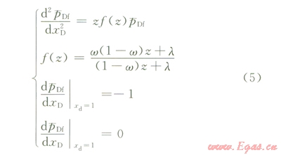 式中z為與滲流數(shù)學(xué)模型無因次時(shí)間相對應(yīng)的拉普拉斯空間自變量;`RDF為拉普拉斯空間中儲層裂縫系統(tǒng)無因次壓力;w為裂縫—孔隙雙重介質(zhì)儲層的儲容比,無因次;l為裂縫—孔隙雙重介質(zhì)儲層的竄流系數(shù),無因次;f(z)為綜合描述裂縫系統(tǒng)和孔隙系統(tǒng)儲滲級差關(guān)系的函數(shù)值,無因次;xD如為研究單向線性滲流問題的一維坐標(biāo)系中無因次坐標(biāo)值,設(shè)定氣水區(qū)交界處xD=0,水區(qū)外邊界處xD=l。