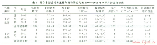已累計(jì)完鉆的300余口水平井,主要集中于靖邊氣田和蘇里格氣田,開發(fā)層系為下古生界馬家溝組馬五,3層和上古生界下石盒子組盒8段。針對(duì)上古生界氣藏地質(zhì)特征,通過二維地震選區(qū),三維地震提高含氣砂體預(yù)測(cè)精度,骨架井鉆探落實(shí),精細(xì)氣藏描述解剖,實(shí)現(xiàn)整體研究,整體部署,整體開發(fā),水平井有效儲(chǔ)層鉆遇率大幅提高(大于60%),分段壓裂技術(shù)突破10段,單井產(chǎn)量平均達(dá)到直井的3~10倍,最高達(dá)到l2倍,單支鉆井隊(duì)最高實(shí)現(xiàn)一年中開鉆6口井完鉆6口井,最短鉆井周期26.96d,最短建井周期39.67d,多口井無阻流量超過l00×104m3/a。生產(chǎn)表明,已投產(chǎn)的水平井占日開井總數(shù)4.5%,產(chǎn)出約23%的氣量,開發(fā)效果顯著(表1)。