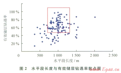 蘇里格氣田水平井開發(fā)主力層為盒8段儲(chǔ)層,屬辮狀河沉積,河道遷移迅速,砂體在平面上和縱向上交替疊置。統(tǒng)計(jì)結(jié)果表明,砂巖鉆遇率多在70%以上,但有效砂體規(guī)模小,連續(xù)性和連通性差,鉆遇率多數(shù)小于50%。蘇l4井區(qū)、蘇6井區(qū)及蘇l0井區(qū)進(jìn)行的加密井網(wǎng)試驗(yàn)表明:有效單砂體厚度一般為2~6m,寬度400~800m,長(zhǎng)度900~1200m,以孤立型、切割疊置型、堆、積疊置型、橫向局部連通型賦存于地層中,僅在局部疊置規(guī)模較大。通過對(duì)盒8段為目標(biāo)層的233口水平井分析表明:平均有效儲(chǔ)層鉆遇率僅59.91%;單層有效砂體長(zhǎng)度小,僅l0口井l00%鉆遇有效砂體,其中7口井長(zhǎng)度大于l000m,最長(zhǎng)ll72m;96%井鉆遇多套砂體,泥巖段長(zhǎng)度大于50m的有l86口。表明砂巖在空間分布不均,非均值性強(qiáng)。水平段長(zhǎng)度、砂體長(zhǎng)度、有效儲(chǔ)層長(zhǎng)度三者正相關(guān),表明:水平段長(zhǎng)度越長(zhǎng),溝通多個(gè)砂體的機(jī)率更高;在800~1200m范圍內(nèi)儲(chǔ)層鉆遇率高(圖2),鉆穿多套砂體的有效儲(chǔ)層鉆遇率明顯下降;根據(jù)對(duì)已生產(chǎn)井的動(dòng)態(tài)分析,水平段長(zhǎng)度與井控儲(chǔ)量、無阻流量不呈線性增長(zhǎng)關(guān)系;應(yīng)用l6口生產(chǎn)時(shí)間較長(zhǎng)的水平井修正了Joshi非均質(zhì)氣藏水平氣井產(chǎn)能公式,進(jìn)而進(jìn)行計(jì)算后表明,隨著水平段長(zhǎng)度增加,無阻流量增加的幅度變緩,且在800~1200m出現(xiàn)拐點(diǎn)(圖3);動(dòng)靜態(tài)資料證明有效砂體在單層范圍內(nèi)展布局限,水平段長(zhǎng)度并非越長(zhǎng)產(chǎn)量越高。
