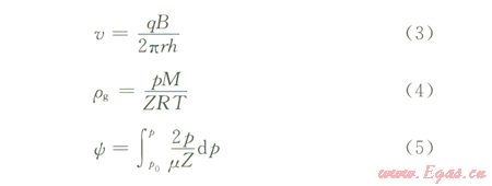 Kg為氣相滲透率,mD;Kw為水相滲透率,mD;lg為氣相啟動壓力梯度,atm/cm(1atm=98.0665kPa);lw為水相啟動壓力梯度,atm/cm;lgy,為原始狀態(tài)下的氣相啟動擬壓力梯度,atm2/(mPa·s·cm);rw 為井筒半徑,cm;re為氣井控制半徑,cm;mg為氣體的黏度,mPa·s;mw為地層水的黏度,mPa·s;`mg平均地層壓力下氣體的平均黏度,mPa·s;qwsc為標況下產(chǎn)水量,cm3;qgsc為標準狀況下產(chǎn)氣量,cm3/S;h為氣層厚度,cm;b為描述孔隙介質(zhì)紊流影響的系數(shù),稱為速度系數(shù),cm-l;rg為氣體密度,g/cm3;rw為地層水密度,g/cm3;qgAOF為天然氣無阻流量,cm3/s;Pi為原始地層壓力,arm;Pe為某時刻地層壓力,atm;Pwf為井底壓力,atm;Psc為地面標準狀況下壓力,atm;ye為某時刻地層擬壓力,atm2/(mPa·s);ywf為井底擬壓力,atm2/(mPa·s);G為氣井控制儲量,cm3;Gp為氣井累計產(chǎn)氣量cm3;Zi為原始條件下氣體壓縮因子;`Z為平均地層壓力下氣體的壓縮因子;Zsc為地面標準狀況下氣體的壓縮因子;T為氣層溫度,K;R為氣體常數(shù),82.053atm·cm3/(mol·K);We為累計水侵量,cm3;Wp為累計產(chǎn)水量,cm3;Bg為氣相體積系數(shù);Bw為水相體積系數(shù)。