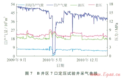 B井區(qū)投產(chǎn)氣井7口,2009年7月至2011年4月開展定壓試驗,累計產(chǎn)氣20.778 1×108m3,地質(zhì)儲量采出程度34.06%。試驗期間平均生產(chǎn)油壓為6.0MPa,產(chǎn)氣量52.0201×104m3/d;試驗?zāi)┢诰诋a(chǎn)氣量為36.8238×104m3/d(圖7、8、9)。