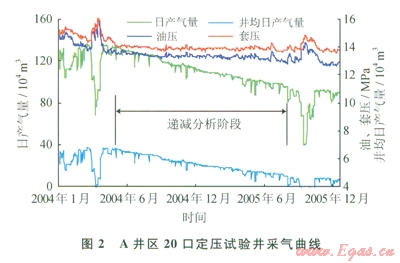 A井區(qū)投產(chǎn)井27口,2004年1月開始定壓生產(chǎn)試驗,累計產(chǎn)氣24.1306×108m3,地質(zhì)儲量采出程度12.11%。試驗期間平均生產(chǎn)油壓l3.5MPa,2005年10月檢修關(guān)井結(jié)束。7口井受到動態(tài)監(jiān)測影響生產(chǎn)不連續(xù),整理符合產(chǎn)量遞減條件的20口試驗井生產(chǎn)數(shù)據(jù),試驗初期產(chǎn)氣量134.2271×104m3/d,試驗?zāi)┢诰诋a(chǎn)氣量98.3783×104m3/d(圖2)。