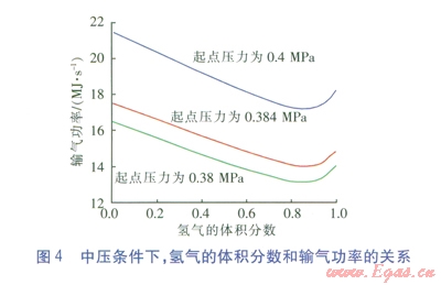 由圖4、5可知,增大管道的壓力降后,無論中壓還是低壓條件,管道的輸氣功率均有顯著提升。在中壓條件下,混合氣體中氫氣的體積分數(shù)為0.23時,為保證輸氣功率不變,則起點壓力需從0.38MPa增大到0.384MPa。在低壓條件下,混合氣體中氫氣的體積分數(shù)為0.23時,為保證輸氣功率不變,則起點壓力需從7kPa增大到7.3kPa。這說明微小提升壓力降,就能保證管道的輸氣能力不變。