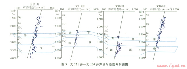 文251井-文100井剖面橫跨西部洼陷、文留主體和東部洼陷,在文留主體和兩側(cè)洼陷斜坡帶發(fā)育沙三2鹽、沙三4鹽和沙一鹽。從聲波時(shí)差對比剖面圖(圖3)上可以看出,西部洼陷斜坡帶的文251井、東部洼陷斜坡帶的文100井、文留主體的文118井,以及新文401井主要發(fā)育沙三鹽間超壓帶和沙一鹽下超壓帶,在橫向上具有較好的對比性,且沙三鹽間超壓帶的超壓幅度明均大于沙一鹽下超壓帶,東、西洼陷斜坡帶的超壓幅度均大于文留主體,說明在異常壓力的動力下,洼陷區(qū)生成的油氣可以向構(gòu)造主體運(yùn)移,也可以由沙三段向淺部的沙二段和沙一段運(yùn)移。