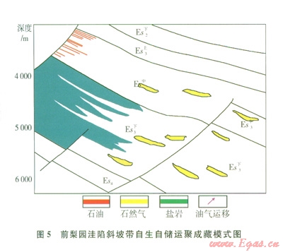 洼陷內(nèi)部發(fā)育的濁積、灘砂或?yàn)蔚韧哥R體狀砂巖儲集體“近水樓臺先得月”,通過近距離運(yùn)移,優(yōu)先捕捉油氣,并在巖性圈閉中聚集成藏,以前梨園洼陷為代表(圖5)。該成藏模式具有如下特點(diǎn):①烴源巖供烴層系單一,為巖性圈閉所在生烴層系;②巖性圈閉以封閉透鏡式為主;③生烴、構(gòu)造運(yùn)動及差異壓實(shí)為巖性圈閉充注油氣提供了動力。