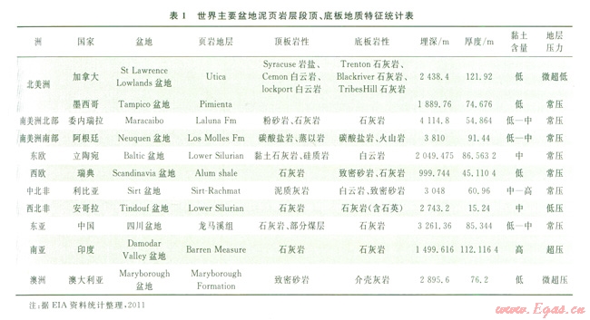 筆者通過文獻(xiàn)調(diào)研[5],對(duì)全球主要盆地含氣泥頁巖層段(系統(tǒng))頂、底板的地質(zhì)特征進(jìn)行了統(tǒng)計(jì)。結(jié)果顯示(表1),世界范圍內(nèi)主要盆地頁巖地層頂、底板巖性以致密的泥頁巖、膏泥巖、膏鹽層、石灰?guī)r、白云巖、火山巖、煤層等為主,屬于非滲透或低滲透巖層。其埋深范圍從l