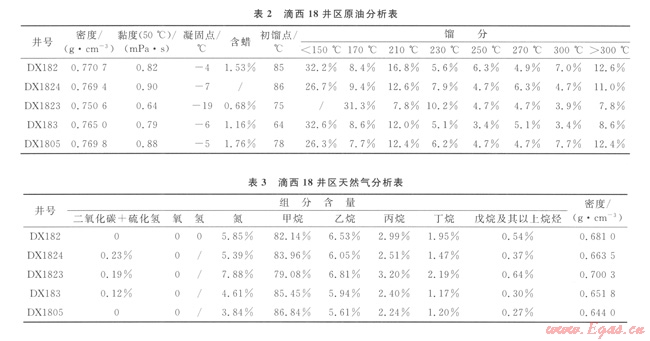DX183與DX1805井的原油分析表可看出二者在黏度、含蠟量、初餾點(diǎn)、不同溫度下餾分百分比等方面差別都較大,這兩口井在天然氣密度、甲烷、氮?dú)狻⒍趸歼@幾個(gè)組分的含量上也有較大差異(表2、3),因此,二者所產(chǎn)氣性質(zhì)差別較大,不是同一氣藏,所以DXl83井與DX1805井試采段應(yīng)不連通。