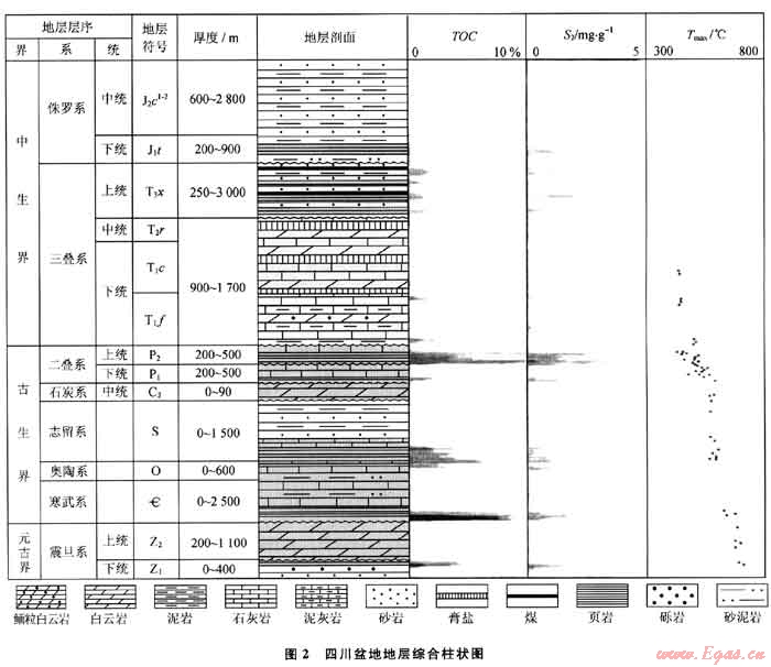 泥頁巖可形成于陸相、海相及海陸交互相沉積環(huán)境中,暗色泥頁巖主要形成于缺氧的閉塞海灣、淘湖、湖泊深水區(qū)、欠補償盆地及深水陸棚等沉積環(huán)境中(姜在興,2003;張愛云等,1987)。碳質(zhì)頁巖常與煤系伴生,一般出現(xiàn)在煤層的頂、底板或夾層中,以湖泊、沼澤環(huán)境沉積為主。石炭紀(jì)-二疊紀(jì)、三疊紀(jì)-侏羅紀(jì)和古近紀(jì)-新近紀(jì)為中國3次主要的成煤期,發(fā)育多套與煤層相伴生的碳質(zhì)頁巖。如中國南方地區(qū)的二疊系龍?zhí)督M(P2l)碳質(zhì)頁巖分布面積較廣,厚度介于200~300m;中國南方揚子地塊、華北地塊及塔里木地塊古生界海相泥頁巖以深水陸棚相沉積為主,如四川盆地古生界發(fā)育多套黑色泥頁巖(圖2),寒武系筇竹寺組、志留系龍馬溪組泥頁巖為大陸邊緣坳陷的深水陸棚相沉積,厚度介于200~400m,含豐富的有機質(zhì)、筆石等海洋浮游生物化石及白生黃鐵礦等;中國陸相沉積盆地中,松遼盆地白堊系、渤海灣盆地古近系、四川盆地三疊系、鄂爾多斯盆地三疊系等發(fā)育多套湖相、湖沼相黑色泥頁巖,含豐富的介形蟲、孢粉、細(xì)菌、高等植物等化石及有機質(zhì),厚度介于200~1500m。