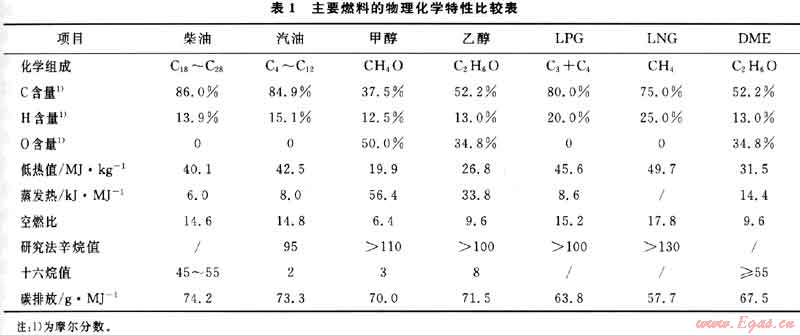 在石油供應(yīng)及其價(jià)格隨世界地緣政治和經(jīng)濟(jì)形勢(shì)變化而不斷劇烈波動(dòng)的21世紀(jì),天然氣作為發(fā)動(dòng)機(jī)燃料有很多優(yōu)點(diǎn):?jiǎn)挝粺嶂?/span>(比能量)最高,尾氣排放最少,C02排放僅為同熱值汽柴油排放量的3/4,利于改善大氣質(zhì)量,供應(yīng)可靠,價(jià)格低且穩(wěn)定少波動(dòng)。主要燃料的物理化學(xué)特性比較見(jiàn)表1[2]。