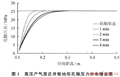 從圖1可以看出,高壓氣層一旦被氣體鉆井揭開后,近井壁地帶孔隙壓力分布發(fā)生明顯變化。井壁表面巖石孔隙壓力與井筒內壓力相等,隨著距井壁表面距離的增加,孔隙壓力逐漸增加,直至恢復原始地層孔隙壓力。