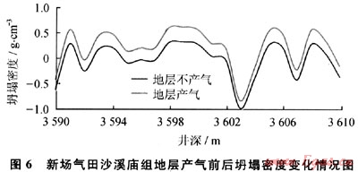 川西地區(qū)新場氣田利用空氣鉆井技術鉆探沙溪廟組地層時,鉆遇產(chǎn)氣層段,產(chǎn)氣層短時間產(chǎn)氣后引起井下遇阻卡鉆事故,隨后被迫轉換為常規(guī)鉆井。利用前面建立的高壓產(chǎn)氣層氣體鉆井井壁穩(wěn)定性評價方法分析了新場氣體沙溪廟組產(chǎn)氣層段不產(chǎn)氣和產(chǎn)氣瞬間兩種情況下的坍塌密度變化情況,如圖6所示。