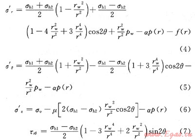 式中σ′r、σ′θ、σ′z和τrθ分別表示徑向、周向、垂向的有效應力和剪切力,MPa;σw表示上覆地層壓力,MPa;σh1、σh2分別表示兩個水平方向主地應力,MPa;α表示有效應力系數(shù),無量綱;μ表示巖右靜態(tài)泊松比;θ表示圓周角,(°);p(r)表示距井壁表面處孔隙壓力,MPa;f(r)表示距井壁表面處拖曳力,MPa。