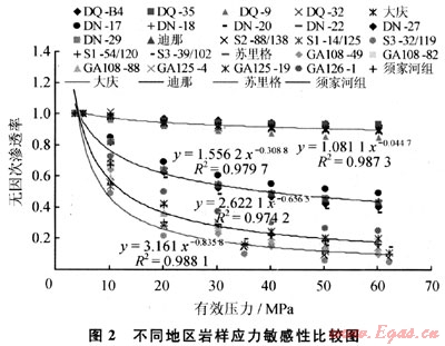 2) 低滲透儲層巖石在實(shí)驗(yàn)分析中均表現(xiàn)出應(yīng)力敏感特征,不同地區(qū)和不同巖石類型具有差異性,在實(shí)際生產(chǎn)中的儲層應(yīng)力敏感性表現(xiàn)形式及其對開發(fā)的影響還需要深入研究。