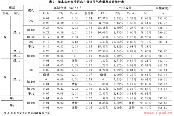 根據(jù)紅沙崗煤礦煤孔瓦斯測定,煤層甲烷(瓦斯)含量非常低,均以氮氣為主(表3[5]);上部煤1層(組)瓦斯含量比煤4、煤5和煤6層(組)高,尤其是煤1-1層甲烷含量是其他煤層的幾倍到幾十倍,可能是煤1-1層直接頂板油頁巖起到的封閉作用最好。