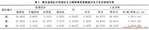 紅沙崗地區(qū)煤層以光亮、半亮型煤為主,鏡煤、亮煤、暗煤常互層出現(xiàn)[5];煤巖顯微組分以鏡質(zhì)組為主(表2),一般超過80%,惰性組很少,殼質(zhì)組含量較高,為3%~8%,對煤層氣的生成有利。