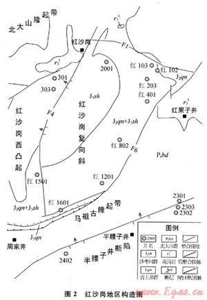 紅沙崗呈北東翹起向南西傾伏的寬緩復(fù)式向斜構(gòu)造[4],軸向北東東(約73°),軸長大于5km;西北翼平緩,傾角10°~20°;東南翼較陡,傾角一般超過25°,北部最陡處可超過55°,次級褶皺、斷裂發(fā)育。